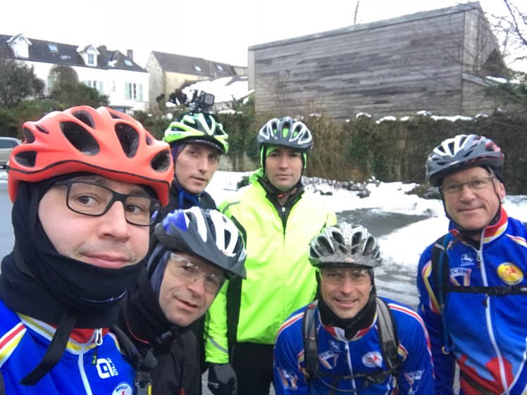 La neige alterne avec la boue, nous rejoignons le mur de Bailly et le longeons jusqu’à la route Bailly/Marly. Nous prenons cette route pour nous ramener vers la forêt de Marly, direction ensuite l’entrée du Parc qui est fermée … nous suivons donc la cloture d’AXA avant de repiquer vers le cimetière de Marly. Nous décidons de rester sur le haut de la forêt. Nous rejoignons la batterie de l’Auberderie. Puis nous suivons le single en parallèle de la route plantée. La motricité précaire, les flaques de neige fondue entame la motivation du Groupe et la moyenne stagne. Nous traversons la route de Noisy/l’étang la ville et suivons des traces de pas jusqu’à retrouver la sortie du tunnel ferroviaire et sa boue amoureuse ! Quel champ de bataille ! Puis c’est la montée vers la route plantée, dur dur ! Arrivée au sommet Luc décide de suivre la route. Les autres tournent à droite et suivent le GR jusqu’à La Croix saint Michel ou un tournage de film nous barre la route. Nous bifurquons à gauche pour rejoindre les boulins. Direction ensuite vers la d98 que nous coupons pour suivre une piste faite de montées et de descentes qui usent les organismes. Arrivée sur la route dauphine que nous coupons pour aller vers BoueLand !!! Certains y laisseront leurs empruntes de pas et de corps… ouf c’est fini nous sommes sur la route Royale en direction du rond point de Saint Nom. On reprend vers la droite sous le pont de l’autoroute puis à gauche pour longer l’autoroute jusqu’à Noisy, le single est compliqué mais nous arrivons à en sortir. C’est enfin la dernière descente et… non c’est pas ma bonne ! On finit donc par un bout de l’avenue Buffon.