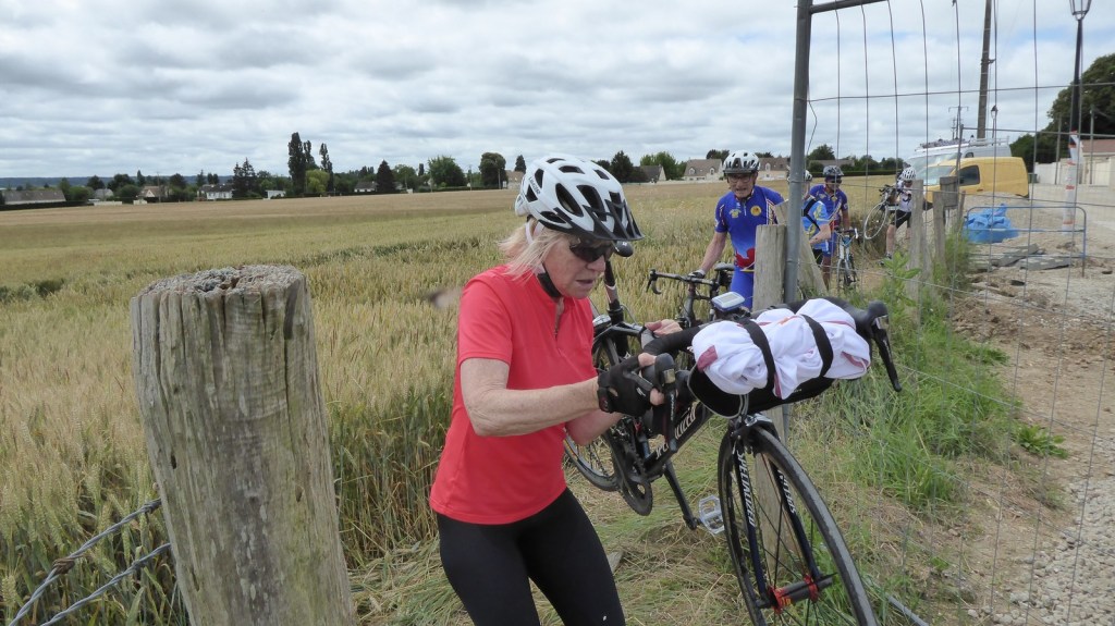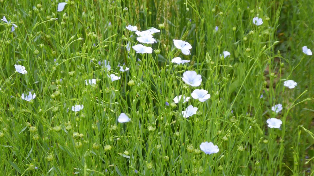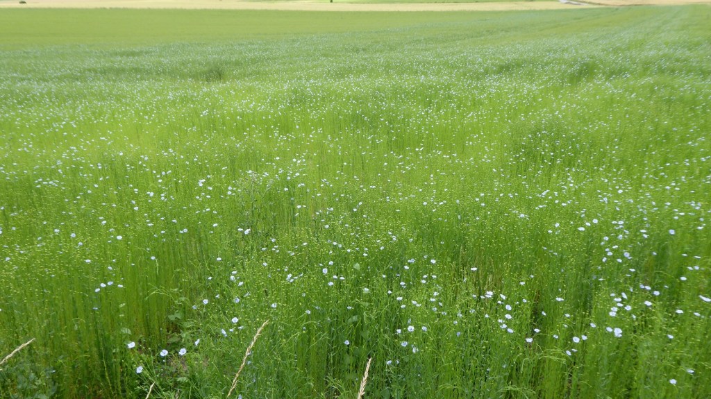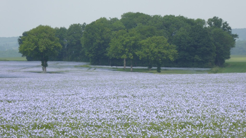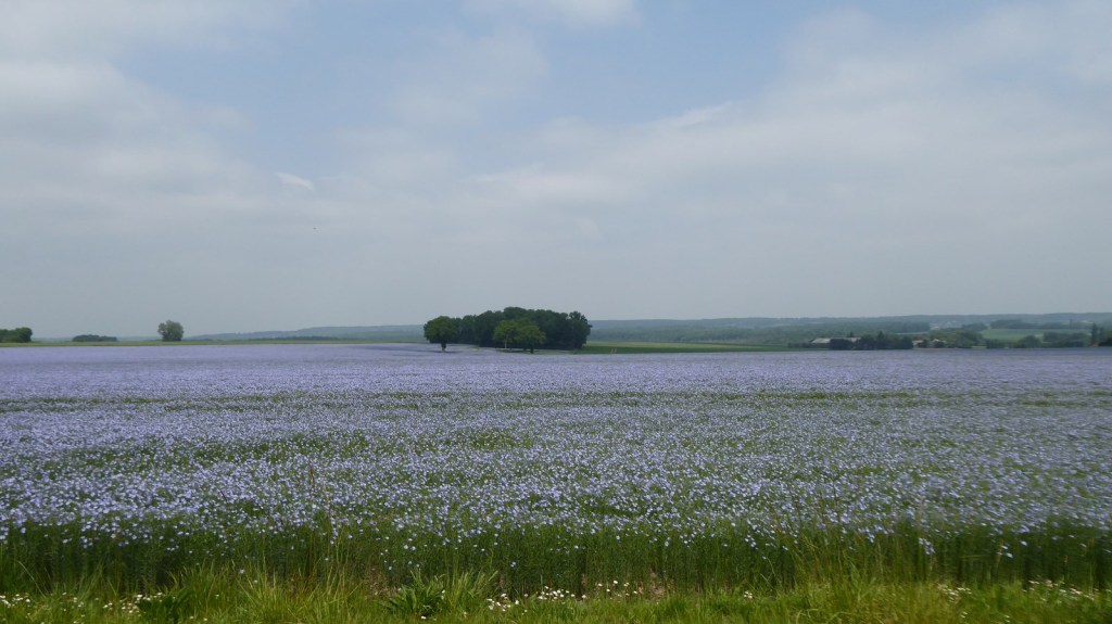 Quelques photos de la sortie du restaurant avec la patronne et d’un magnifique champ de lin sur le chemin du retour. Merci à André pour l’apéro (65 ans).