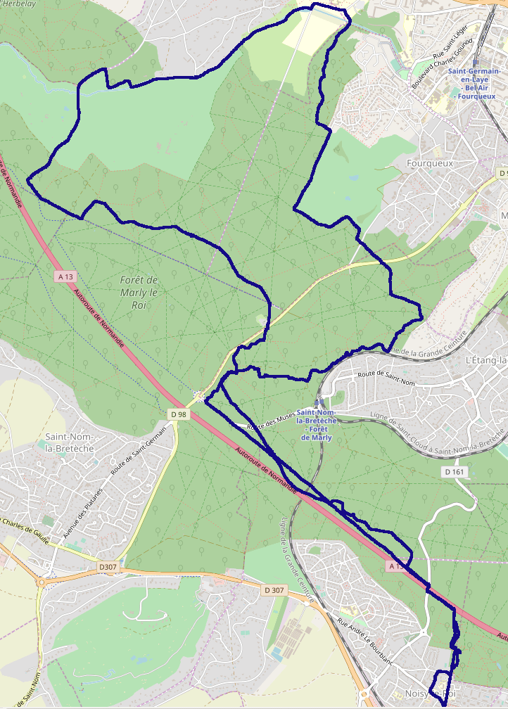 Les plus grands partent ensemble vers la Croix Saint Michel puis vers la gare de Saint-Nom la Bretèche. Avant le golf de Fourqueux, les 2 groupes se séparent pour se retrouver comme convenu à l’entrée du golf de Joyenval, après être passés par le lycée agricole de Saint Germain en Laye. Une pause rapide pour reprendre des forces et remonter en passant par le désert de Retz. Une fois sur le haut de la forêt, nous retrouvons les plus jeunes avec qui nous allons terminer la sortie jusqu’à Noisy.
