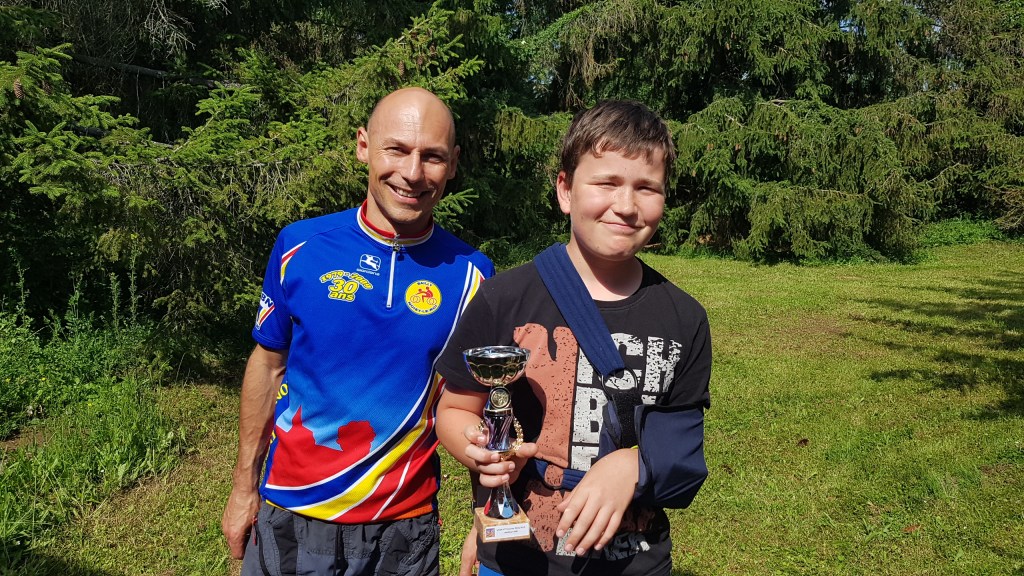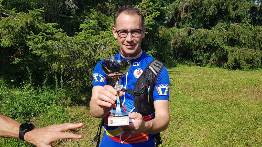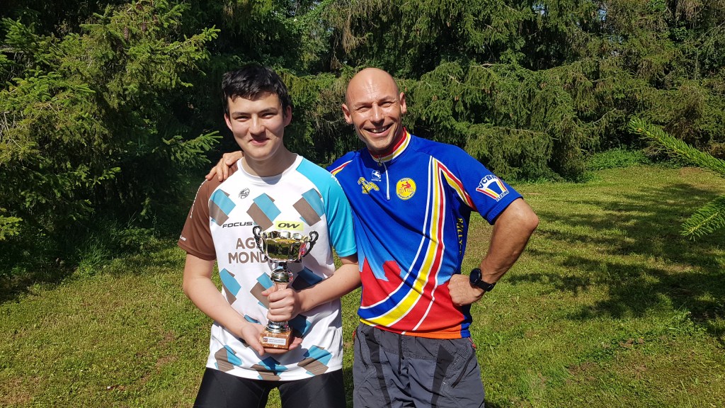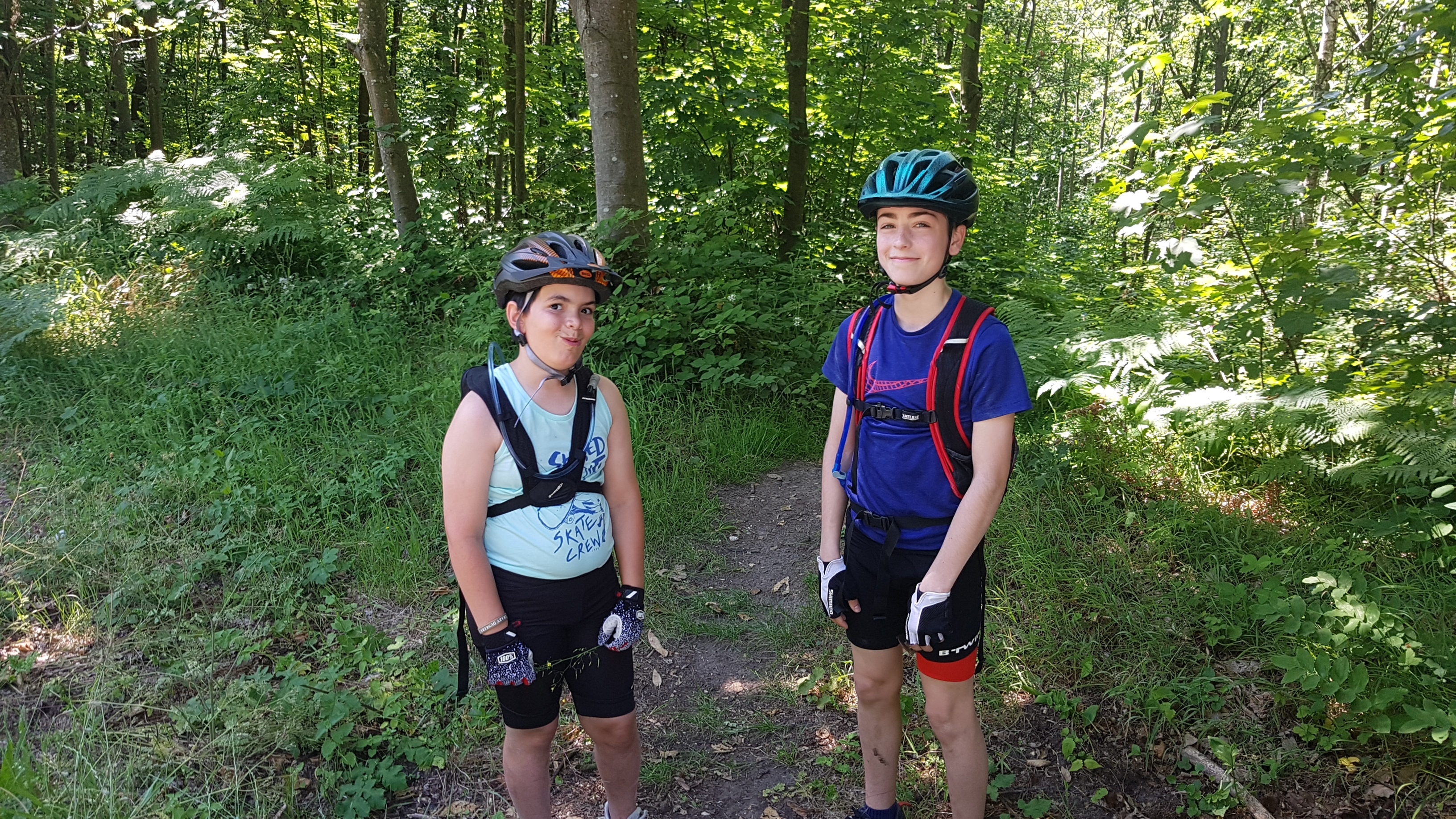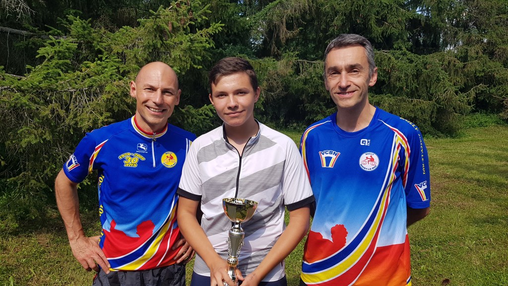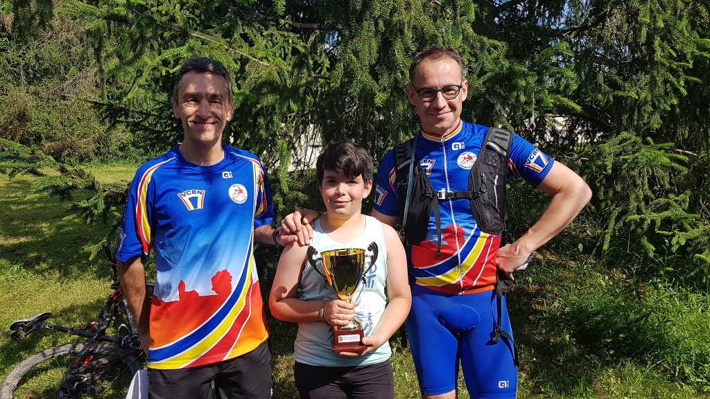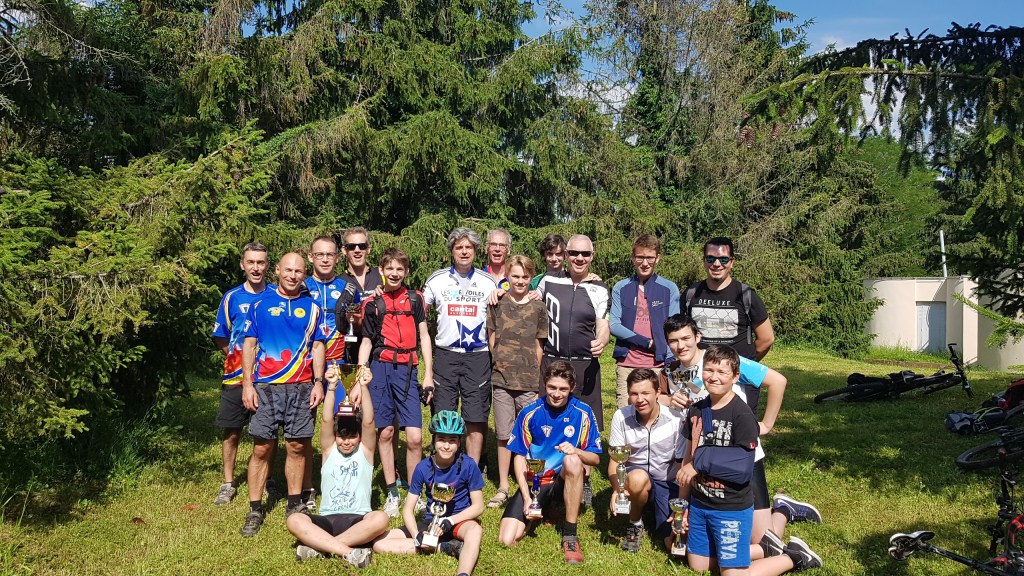 Mais avant les récompenses, nous partons en 2 groupes pour rouler en forêt. Chez les minis et les moyens, regroupés pour la circonstance, la sortie commence très mal, puisque rapidement, dans une descente, Maxime L.-B. fait une mauvaise chute. Son poignet n’a pas résisté, il faut l’évacuer pour le soigner. Après ce coup dur, le groupe repart pour une boucle rapide vers la Croix Saint Michel et le terrain de « dirt ». On y fait une pause et c’est l’occasion de voir deux spécialistes faire des sauts impressionnants dans ce terrain accidenté.