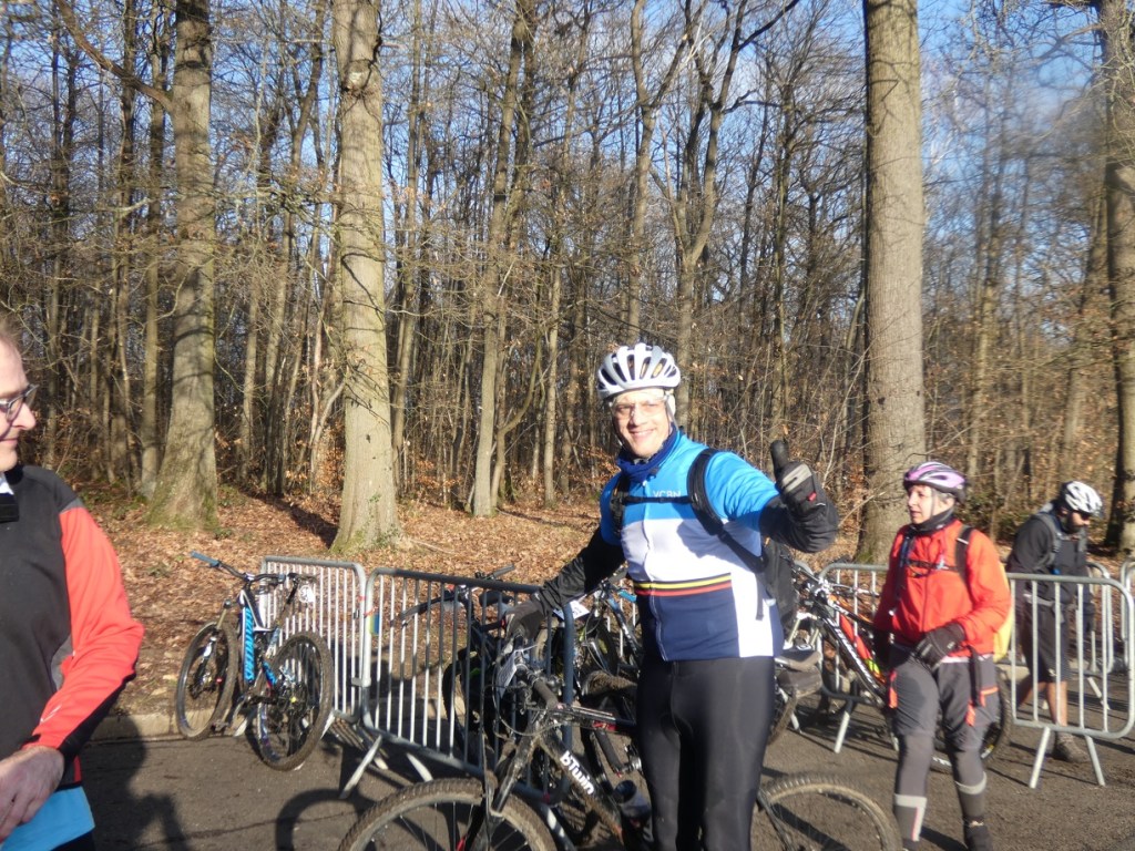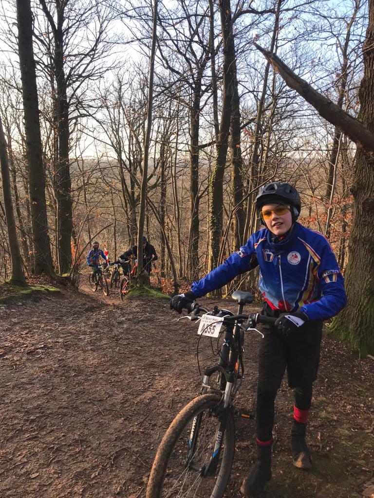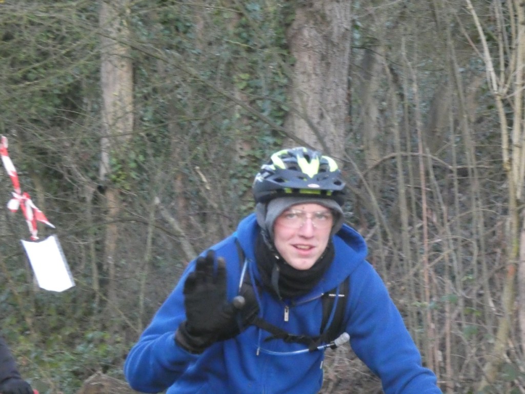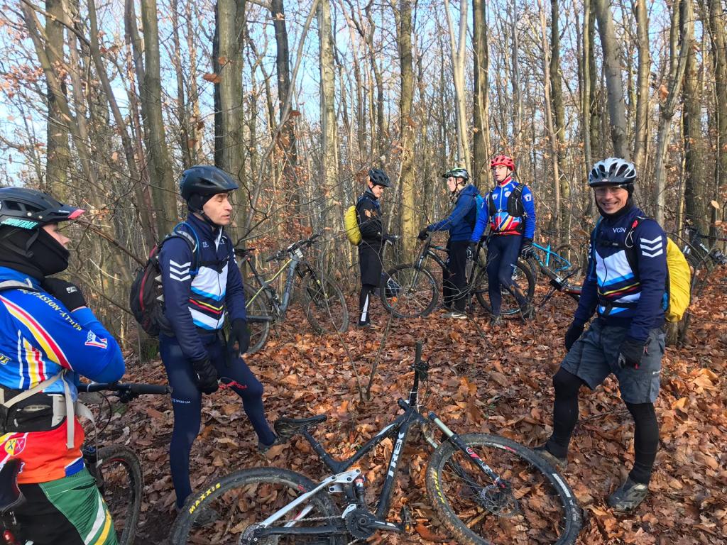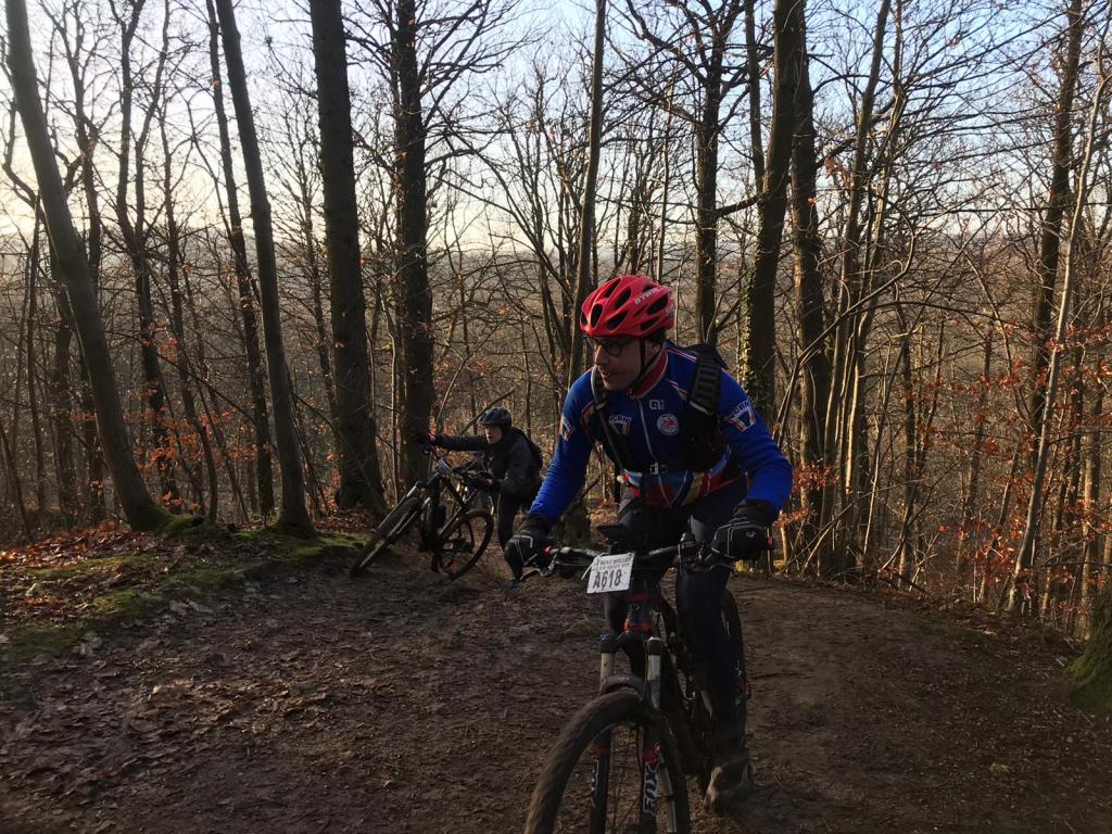 Nous partons avec 5 jeunes courageux, Simon, Gabriel L., Valentin, Oliver et Thibault, encadrés par 5, non moins courageux, adultes ! La première partie du parcours est assez roulante et pas trop boueuse, mais le froid est bien piquant en forêt. Tout se passe bien, malgré quelques petites chutes sans gravité que l’on mettra sur le compte du terrain humide … Puis les descentes et les rudes montées s’enchaînent sans nous laisser de répits. Parfois il faut mettre pied à terre, pour reprendre son souffle ou pour terminer la côte.