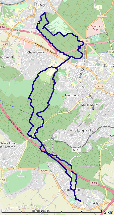 Mais le plus facile est fait, il faut maintenant remonter jusqu’en haut de la forêt de Marly. Pour éviter l’ennuyeuse route des Princesses, nous longeons notre 3ème golf de l’après-midi, celui de Joyenval. Ensuite c’est un retour classique par le petit single le long de l’A13 pour rejoindre Noisy le Roi.