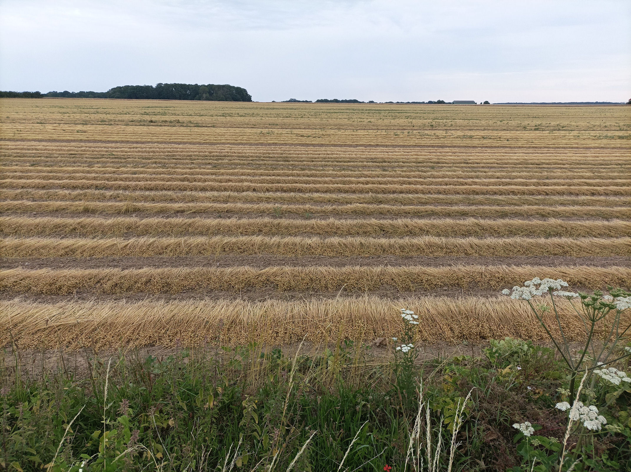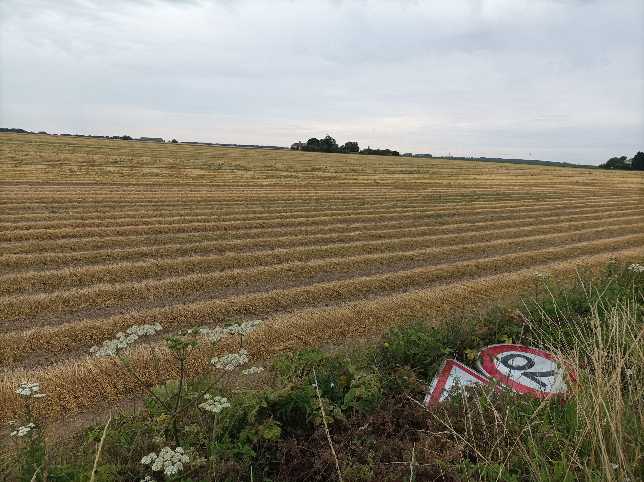 (9:30) 6 trankilous avec passage au P’tit bleu. Sous un ciel chargé , auquel ne manquaient que quelques corbeaux au dessus des blés fauchés pour rappeler les tableaux de Van Gogh, avec des prémices de pluie qui en ont fait rebrousser plus d’un ! Les lins des radars étaient en phase de rouissage !