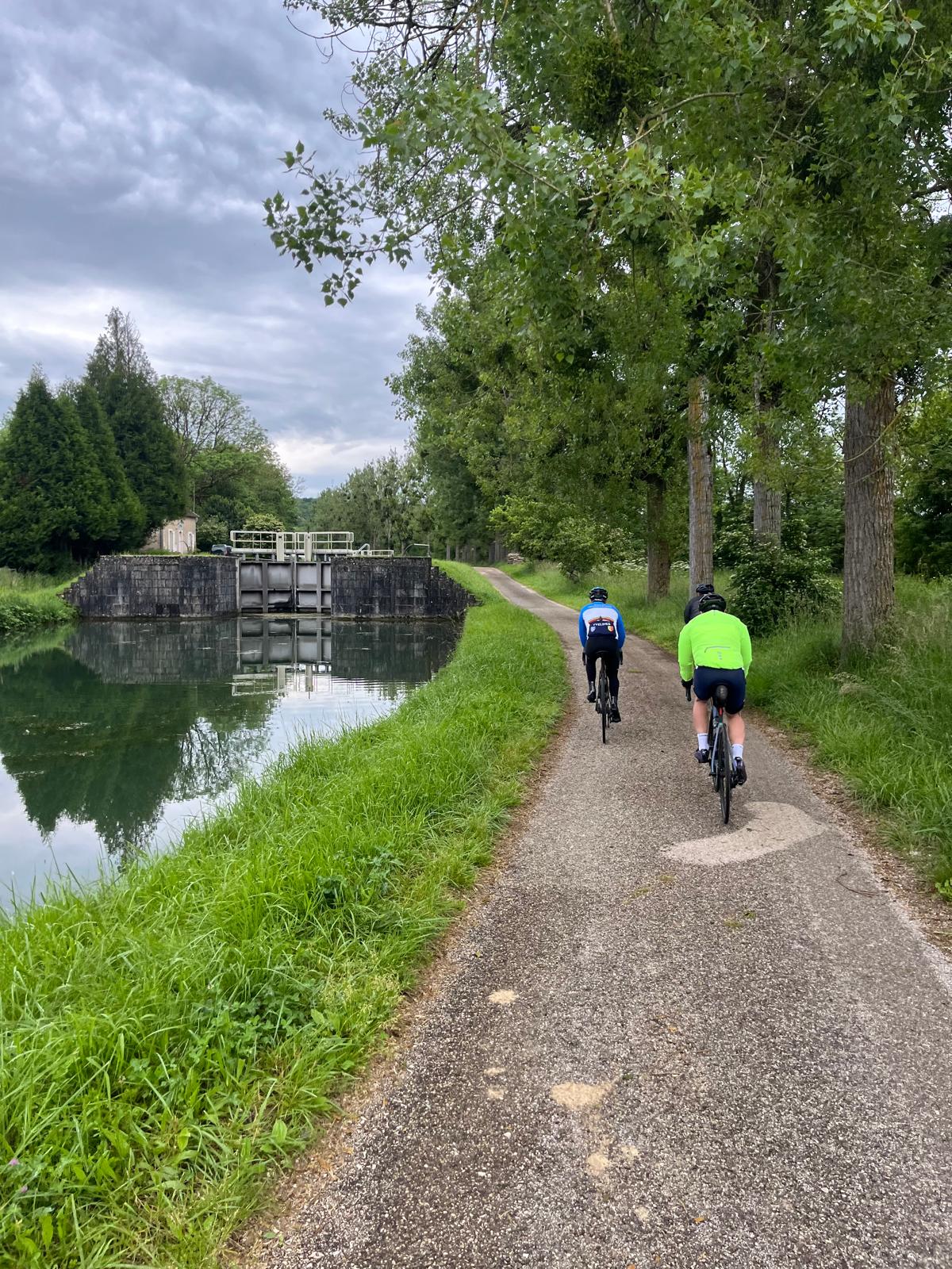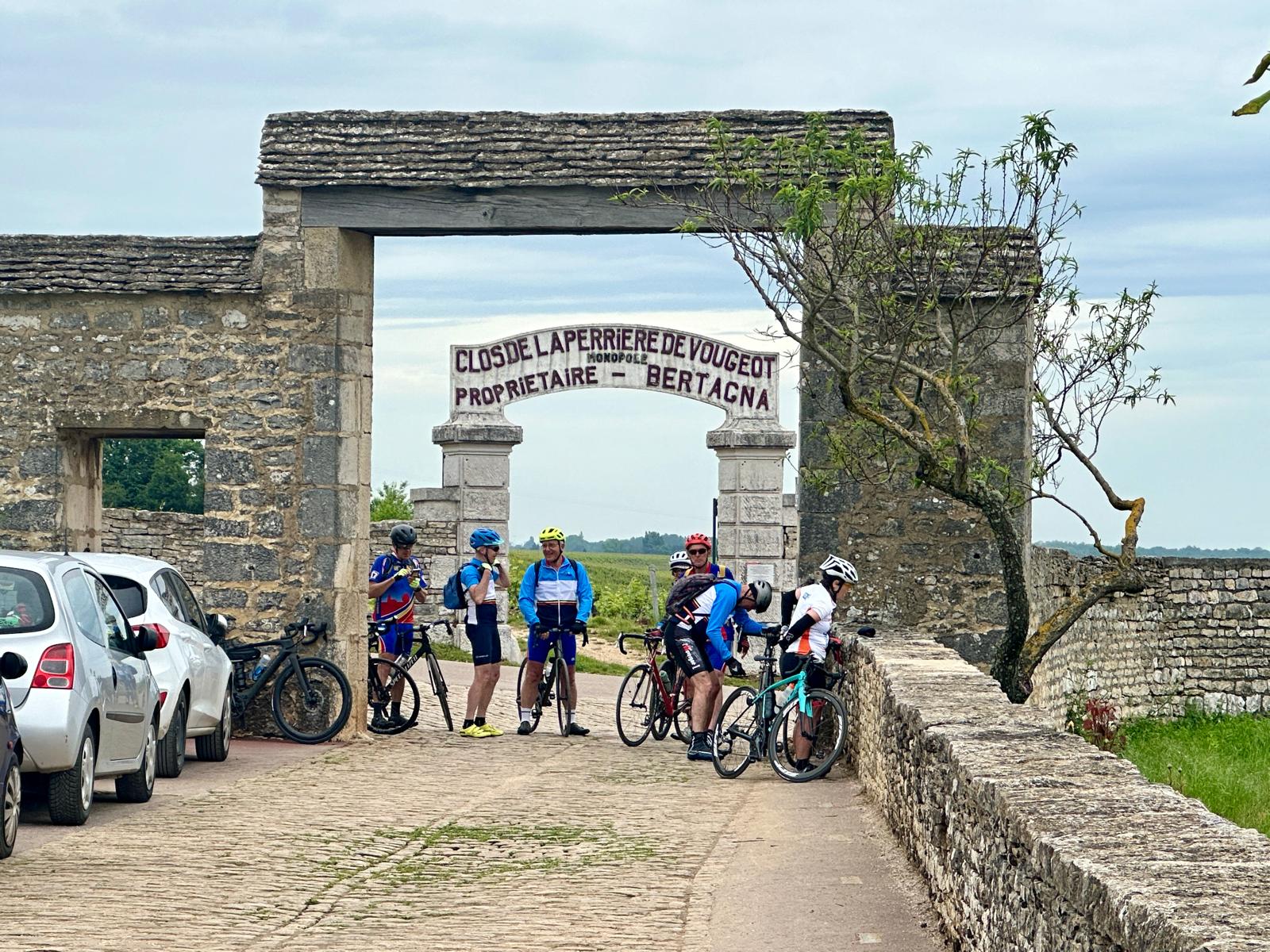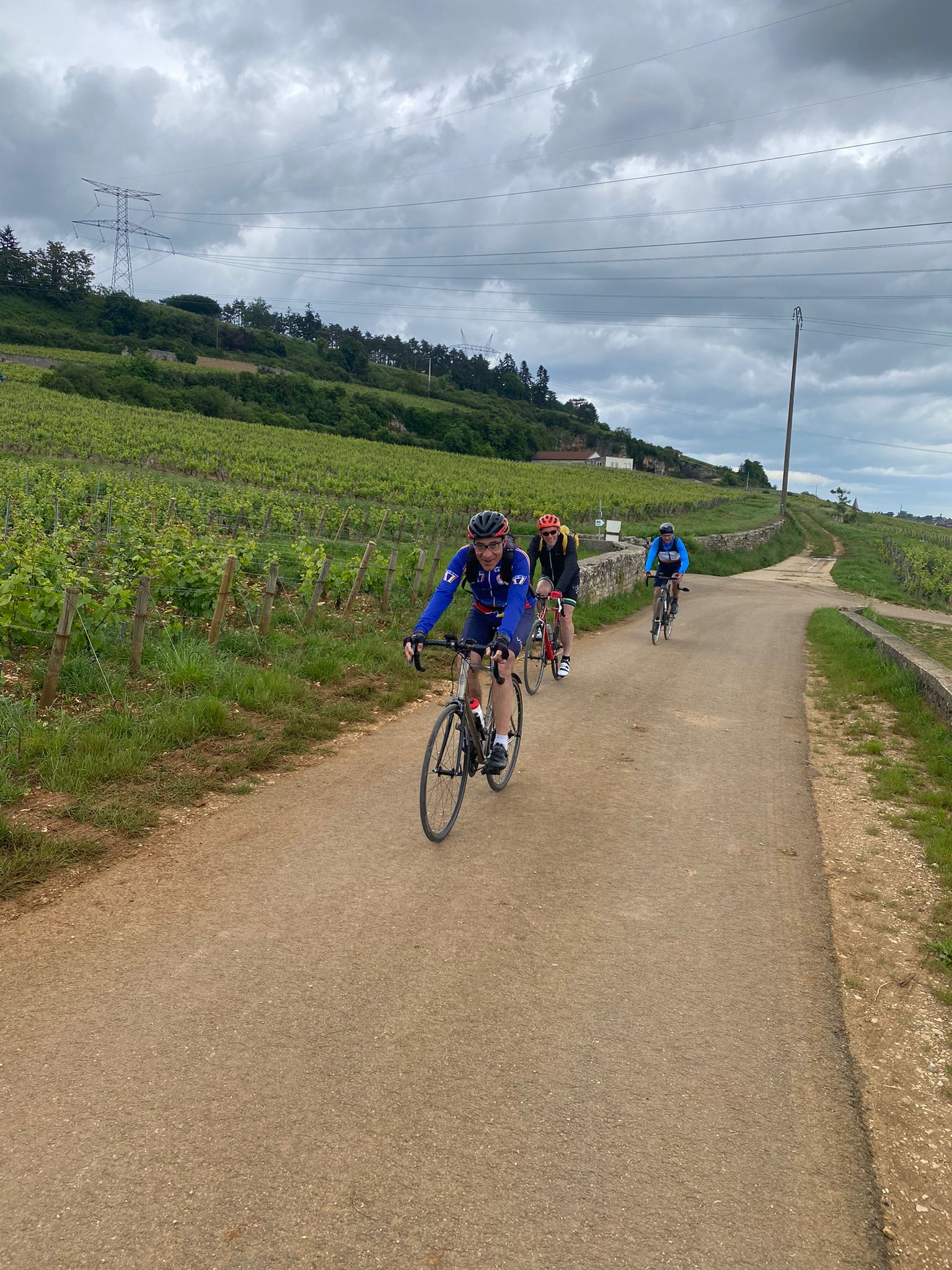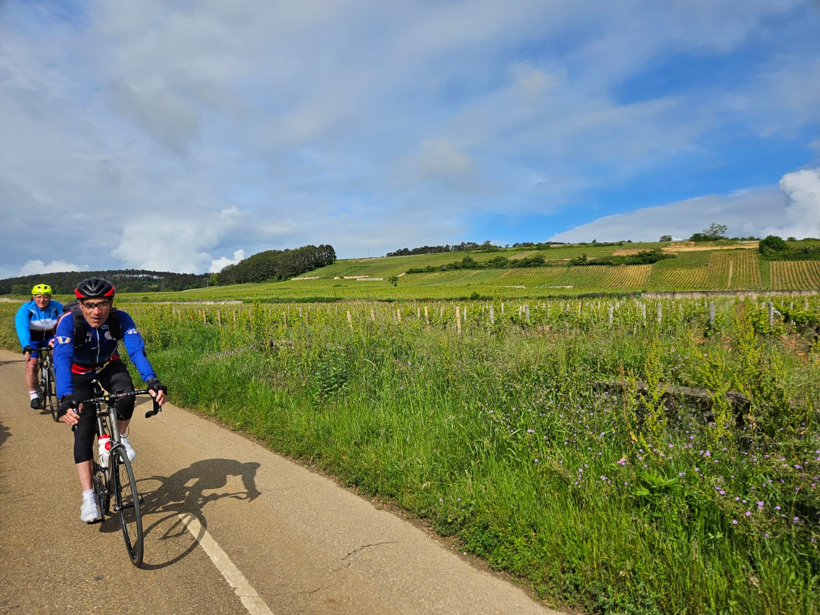 Les départs échelonnés se font sous un ciel très couvert et quelques gouttes de pluie, à travers les vignes de la route des Grands Crus et des noms de village qui font rêver. A Gevrey Chambertin, première difficulté avec la Combe de Lavaux, montée de 6km, suivi d’une « petite » côte de 3 km, où nous croisons une compétition de triathlon avant de redescendre sur la vallée de l’Ouche et le canal de Bourgogne.