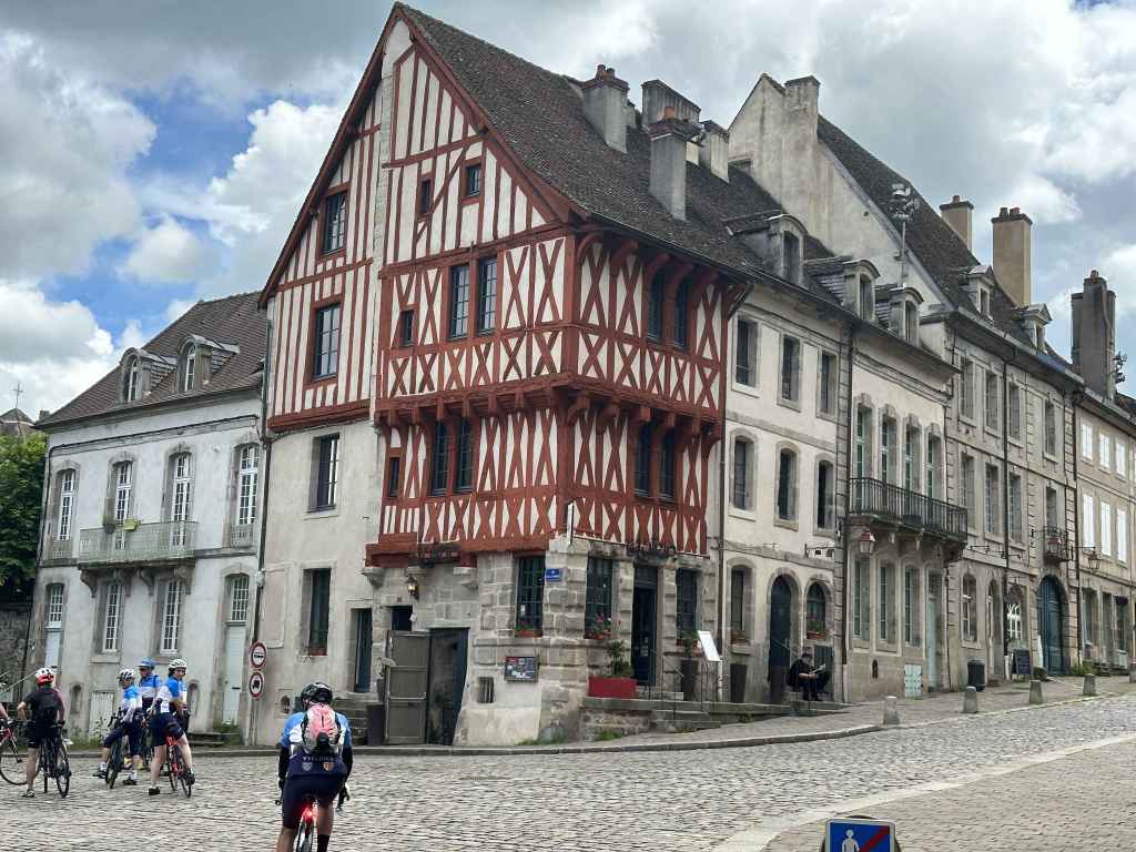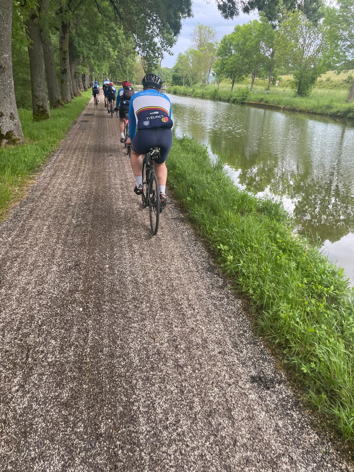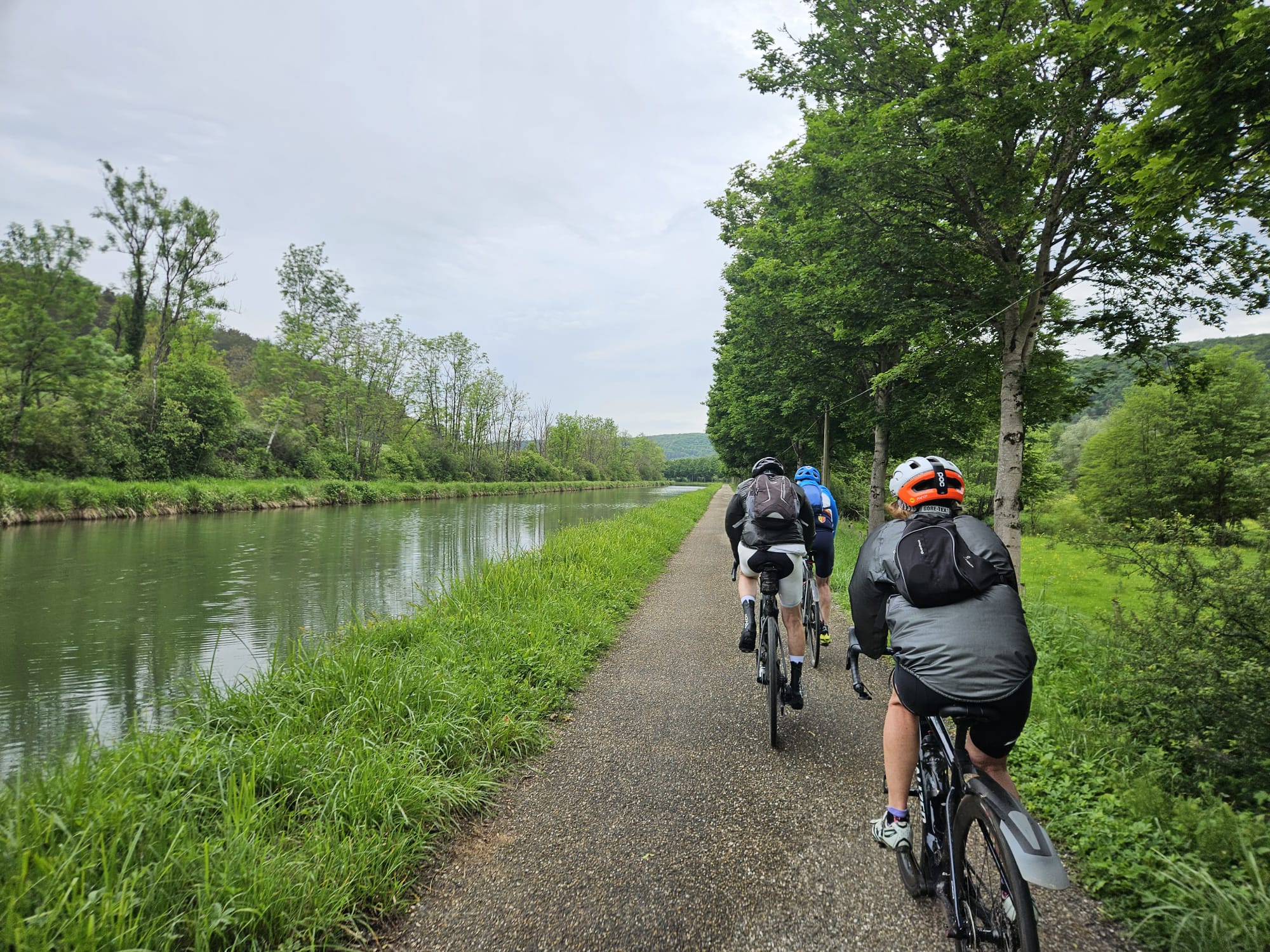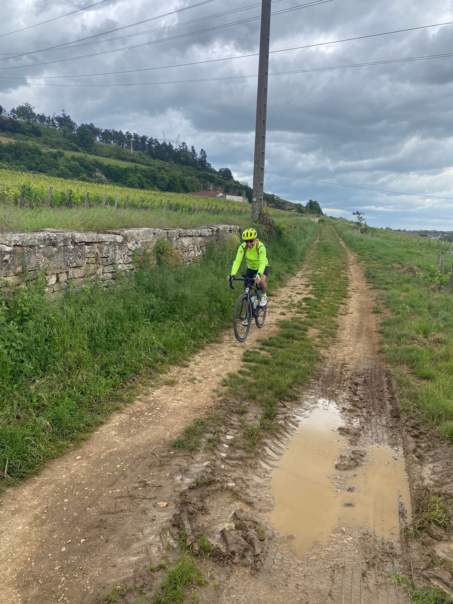 Les départs échelonnés se font sous un ciel très couvert et quelques gouttes de pluie, à travers les vignes de la route des Grands Crus et des noms de village qui font rêver. A Gevrey Chambertin, première difficulté avec la Combe de Lavaux, montée de 6km, suivi d’une « petite » côte de 3 km, où nous croisons une compétition de triathlon avant de redescendre sur la vallée de l’Ouche et le canal de Bourgogne.