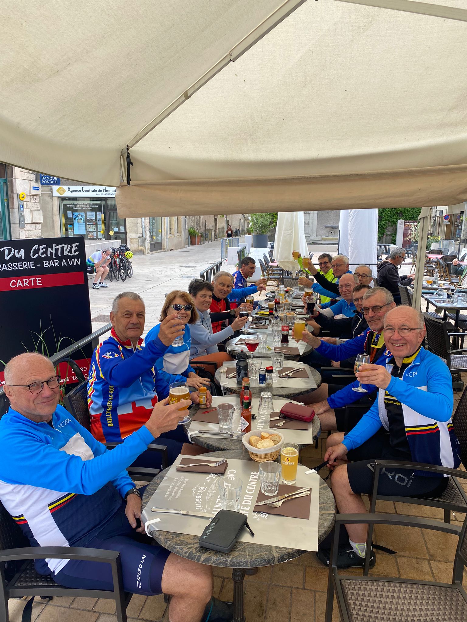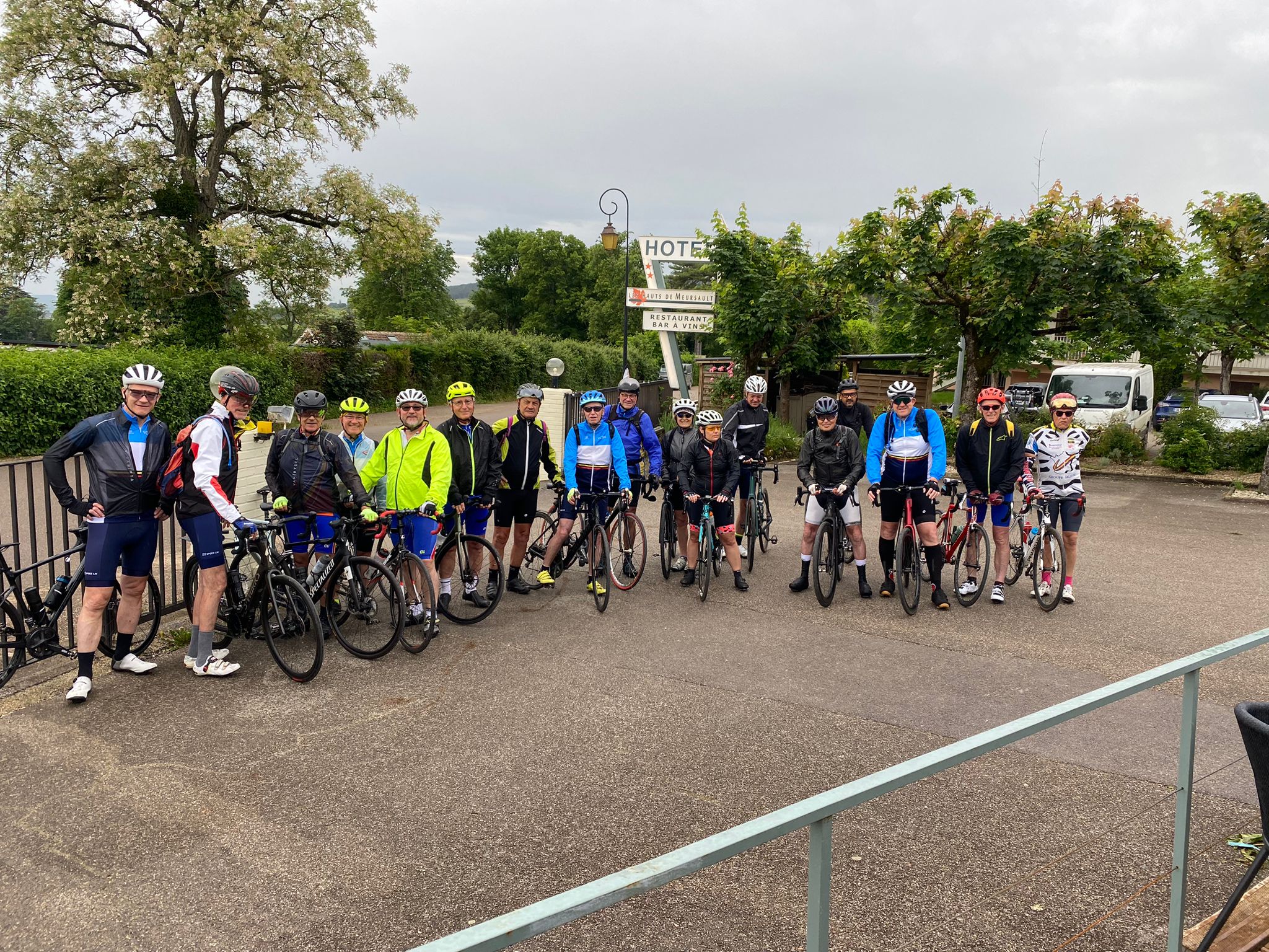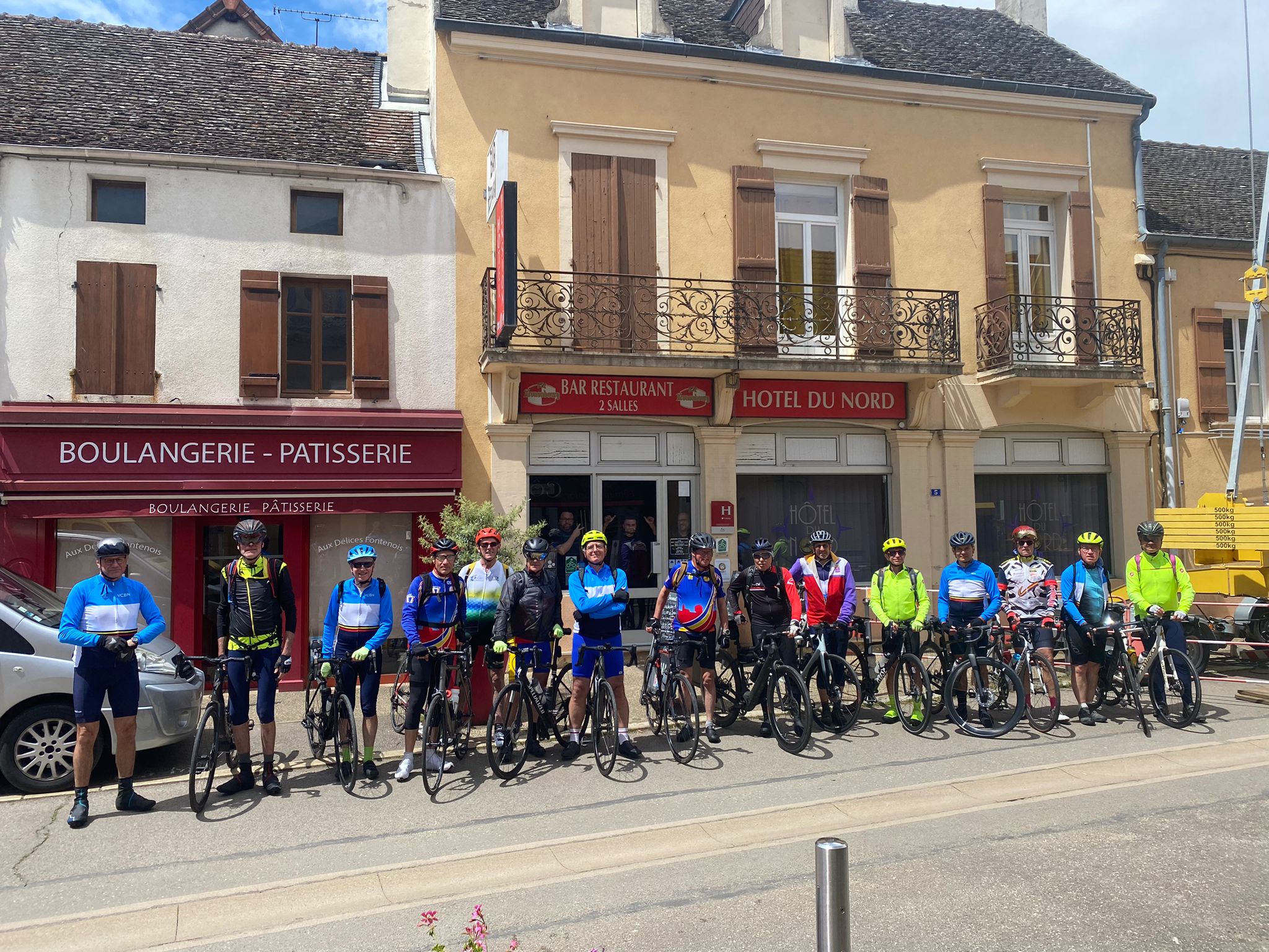 Départ groupé à travers la plaine pour rejoindre le canal du centre à Chagny et atteindre le restaurant de l’hôtel du Nord à Fontaines à 10km au nord de Chalons. Le tracé de l’après-midi est beaucoup plus valloné, avec une côte de plus 4km pour commencer, puis 2 « talus » à 15% dont la côte de la Rochepot.