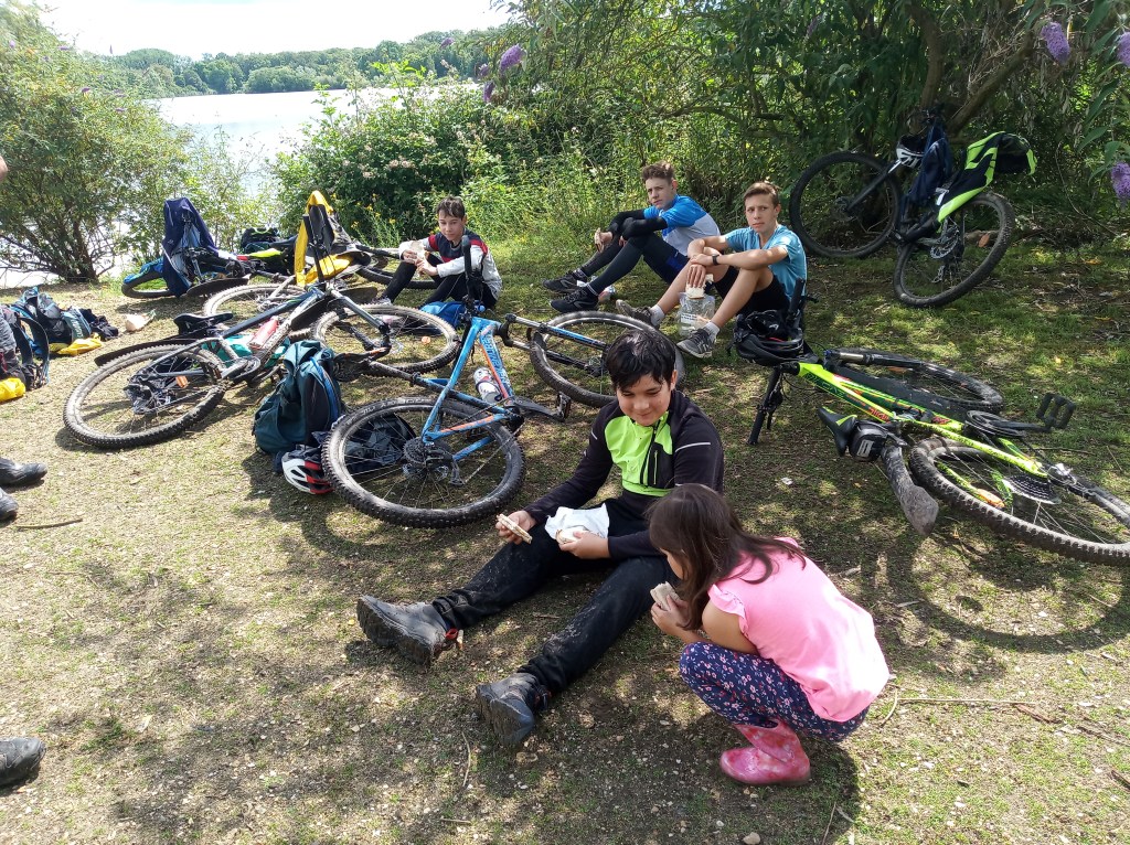 Un rayon de soleil inattendu nous accompagne le temps de la pause, mais notre première averse de la journée nous surprend au moment du départ. Amaury nous a laissé pour rentrer avec sa famille et le reste du groupe repart vers Achères puis le Golf de Saint Germain en Laye et ses fameuses bosses. Nous passons à coté de chez Noé qui en profite pour s’arrêter chez lui et s’éviter ainsi la longue remontée vers Noisy le Roi par la route des Princesses. Au total, les jeunes auront parcouru 57 km (D+ 430 m) en 4h15 sur leur VTT.