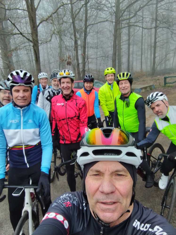 Un gros départ ce matin. 29 sur la photo. Avec un selfie du photographe et la bienvenue à Tanguy, fils de François P. Les Côte Rôtie se sont retrouvés à 12, avec le renfort de Frédéric P et Aurélien C, transfuges du groupe 2.